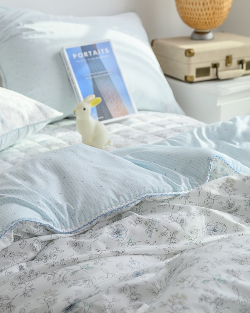 [韓國棉被] 膠原蛋白天絲・栗米棉填充|愛麗絲兔仔碎花 間條蝴蝶結 雙面 四季被 冬被 2色