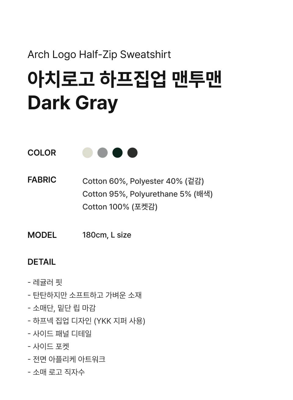 Material : [Exterior] Cotton 60% , Polyester 40% / [Coloring] Polyester 95% , Polyurethane 5% / [Pocketing] Cotton 100%