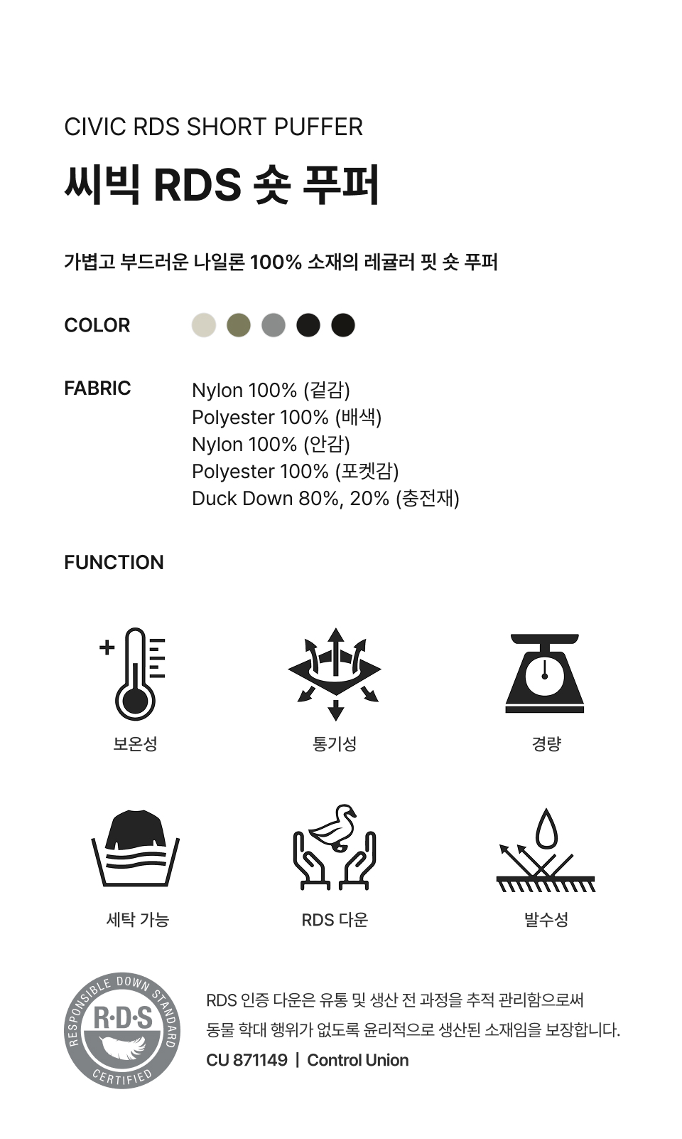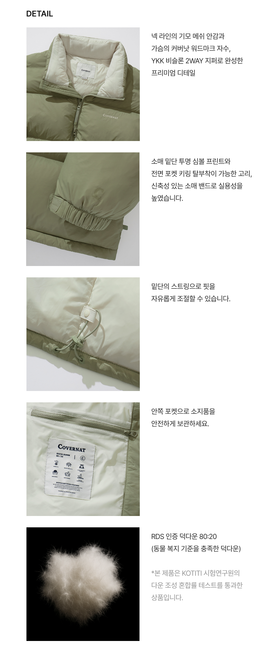 Material : [Exterior] Nylon 100% / [Coloring] Polyester 100% / [Lining] Nylon 100% / [Pocketing] Polyester 100% / [Filling] Duck Down 80%,20%