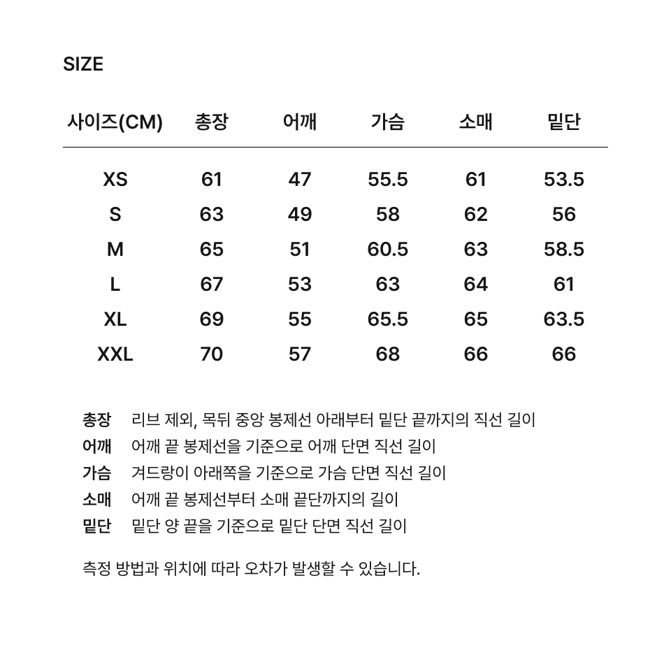 XS: 總長 61 / 肩寬 47 / 胸寬 55.5 / 袖長 53.5 (cm)