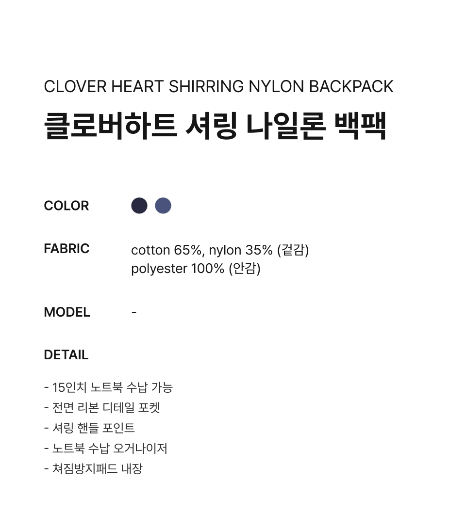 Material : [Exterior] Cotton 65% , Nylon 35% / [Lining] Polyester 100%