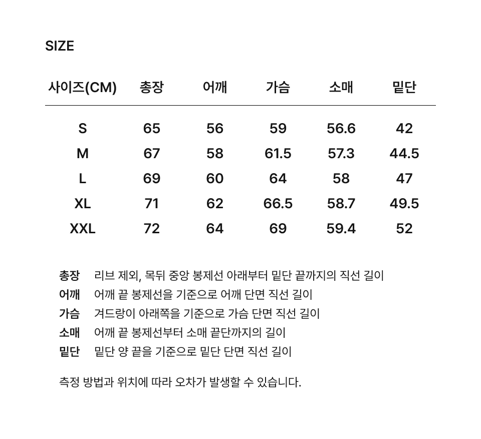 S:總長 65 / 肩寬 56 / 胸寬 59 / 袖長 56.6 / 下擺 42 (cm)