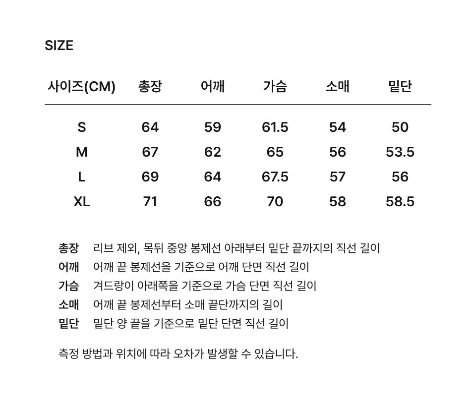 S:總長 64 / 肩寬 59 / 胸寬 61.5 / 袖長 54 / 下擺 50 (cm)