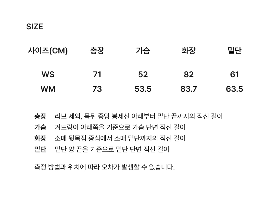 WM:總長 73 / 胸寬 53.5 / 領口至袖口 83.7 / 下擺 63.5 (cm)