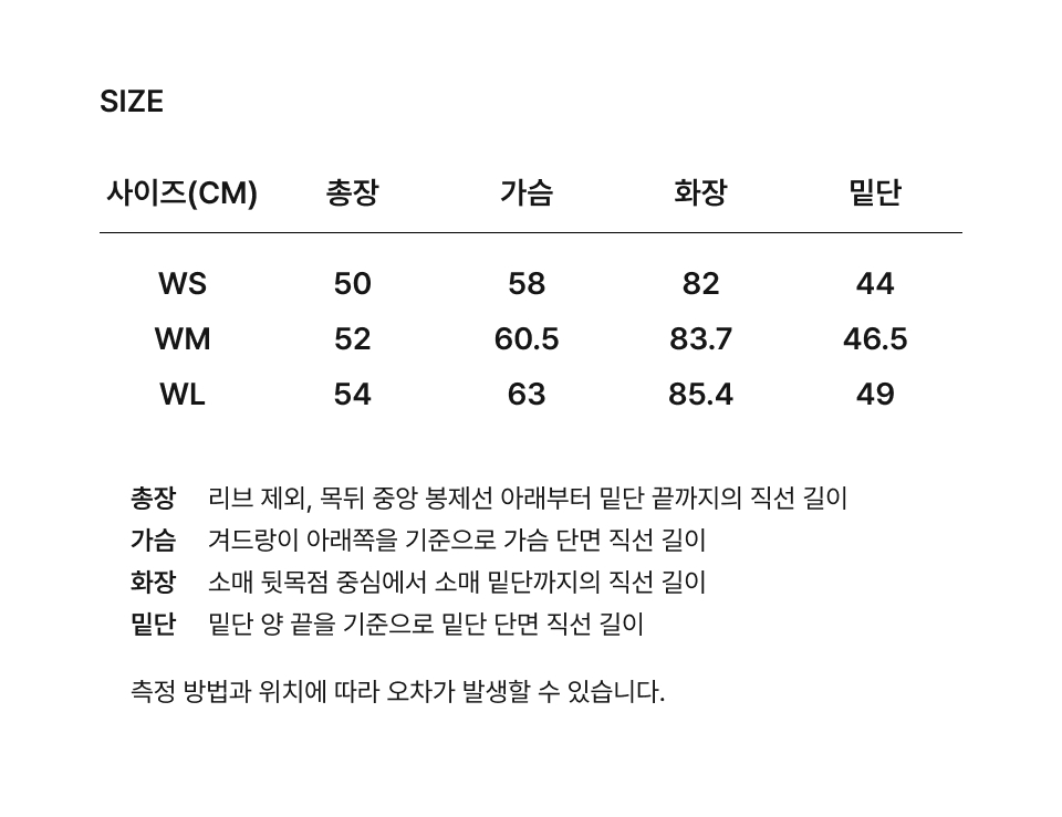 WS:總長 50 / 胸寬 58 / 領口至袖口 82 / 下擺 44 (cm)