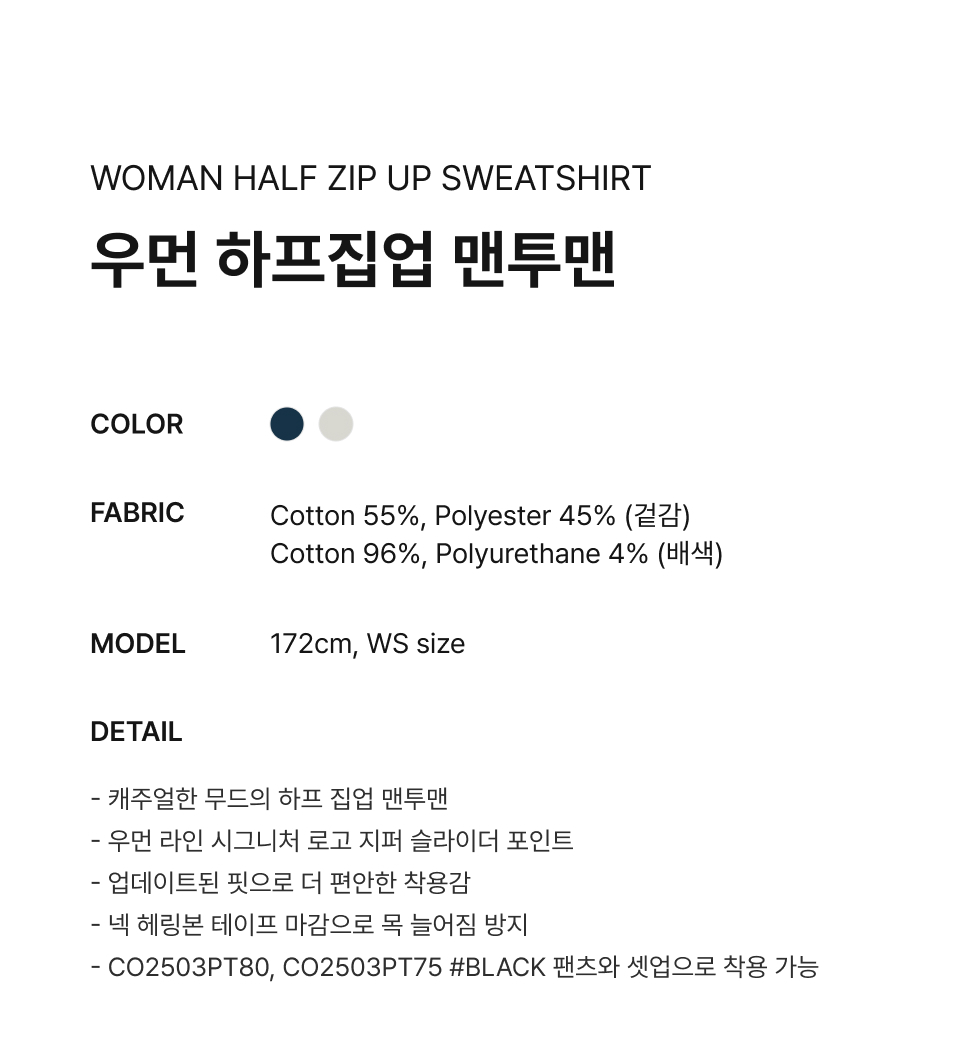 Material : [Exterior] Cotton 55% , Polyester 45% / [Coloring] Cotton 96% , Polyurethane 4%