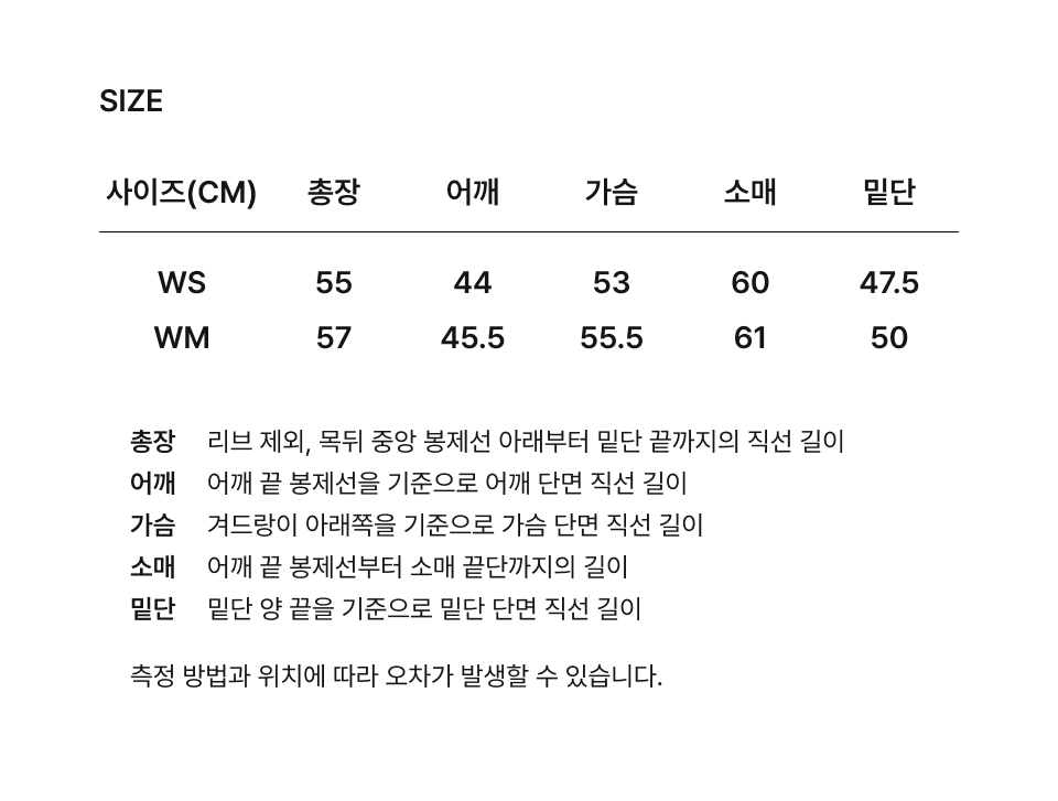 WM:總長 57 / 肩寬 45.5 / 胸寬 55.5 / 袖長 61 / 下擺 50 (cm)