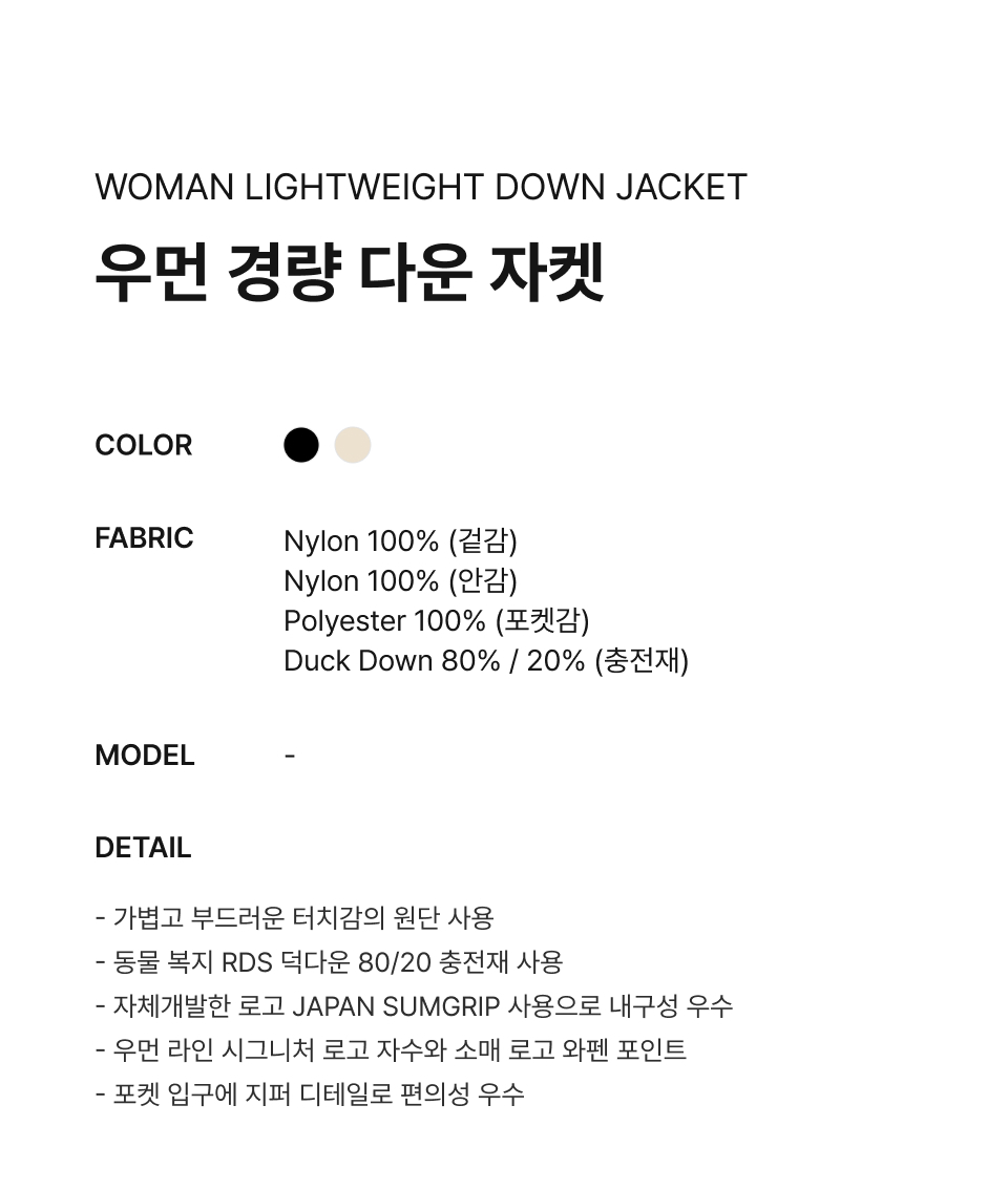 Material : [Exterior] Nylon 100% / [Lining] Nylon 100% / [Pocketing] Polyester 100% / [Filling] Duck Down 80% , 20%