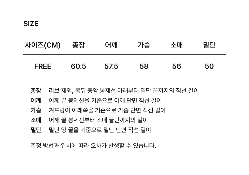 Free:總長 60.5 / 肩寬 57.5 / 胸寬 58 / 袖長 56 / 下擺 50 (cm)