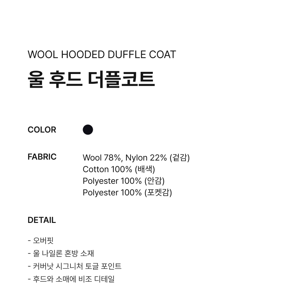 Material : [Exterior] Wool 78% , Nylon 22% / [Coloring] Cotton 100% / [Lining] Polyester 100% / [Pocketing] Polyester 100%