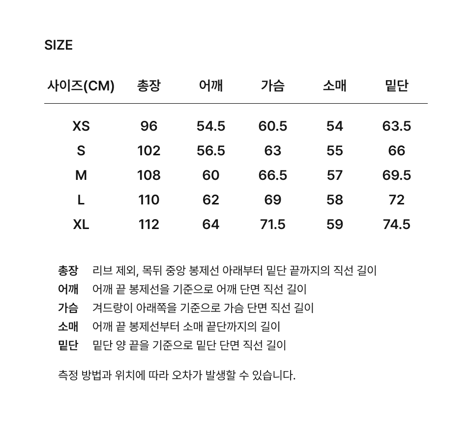 XS:總長 96 / 肩寬 54.5 / 胸寬 60.5 / 袖長 54 (cm)