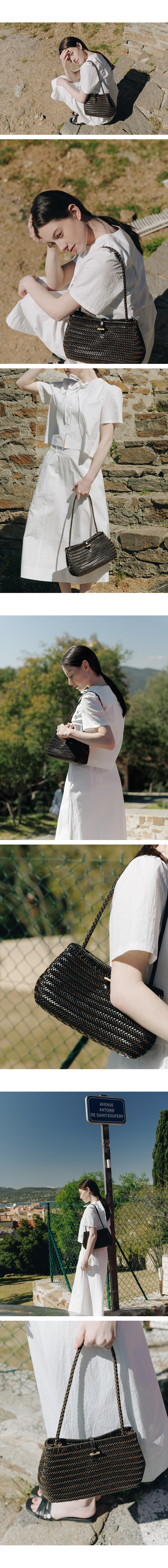 這款編織肩包採用手工編織的皮革肩帶,完美展現了 Lememe 標誌性的復古輪廓。