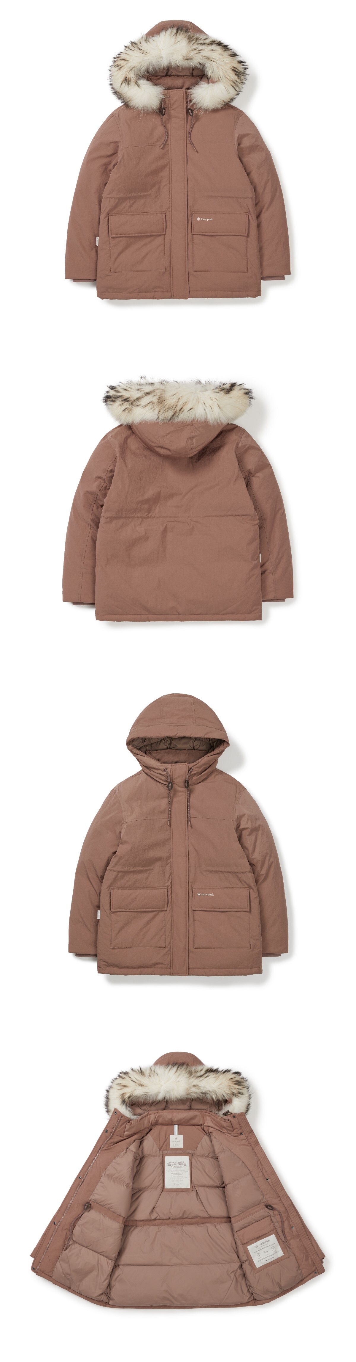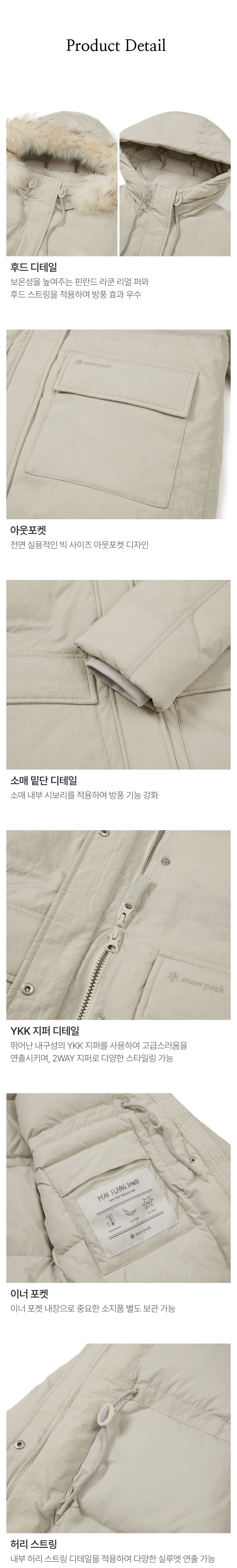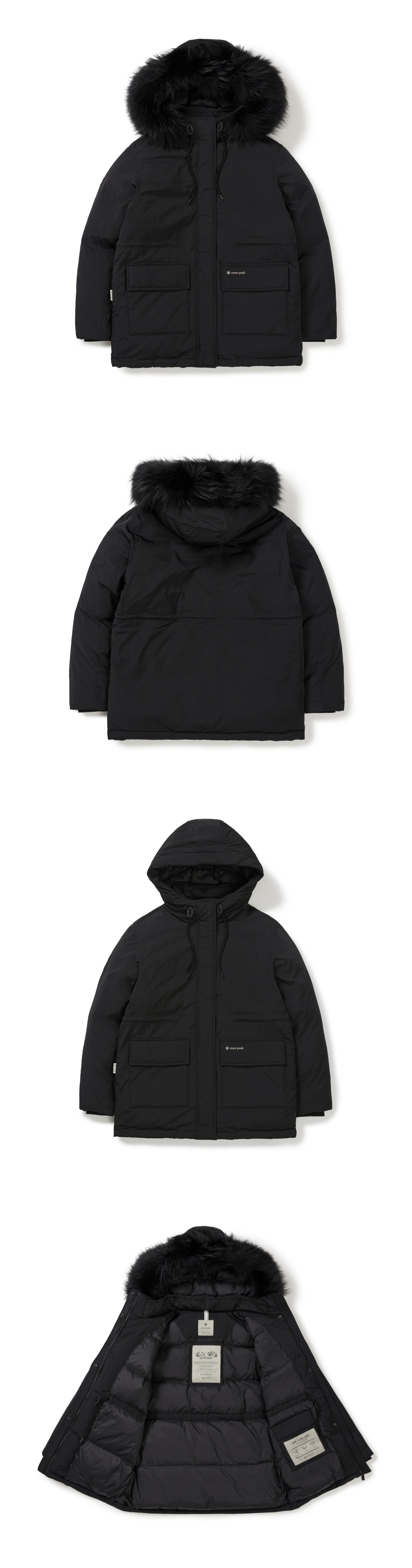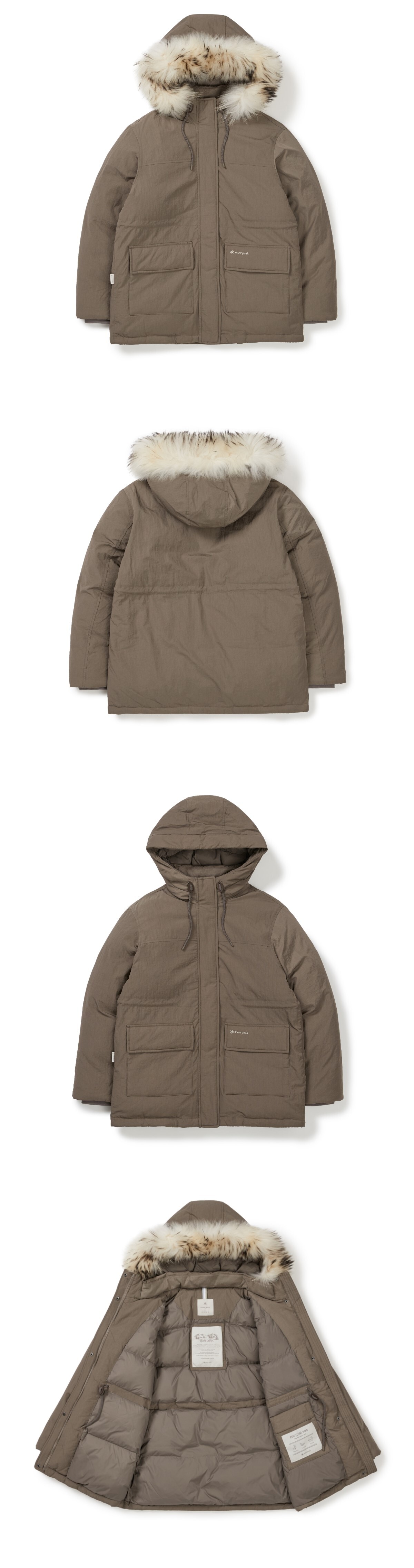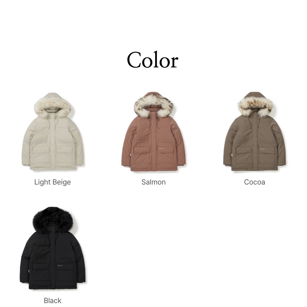 Material : [Exterior] Nylon 100% / [Exterior 2] Polyester 98% , Polyurethane 2% / [Lining] Nylon 100% / [Filling] Fluffy (Duck) 80% , Feather (Duck) 20% / [Charging Bag] Polyester 100% / [Hat Fur] Natural (Raccoon) 100% / [Pocket] 100%