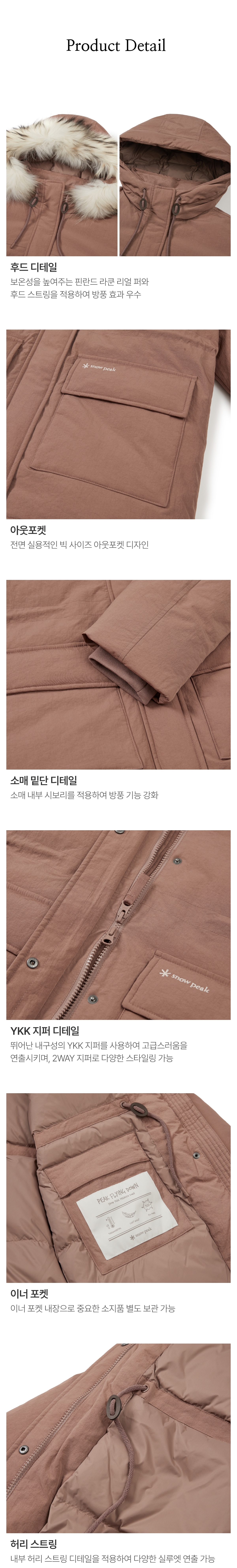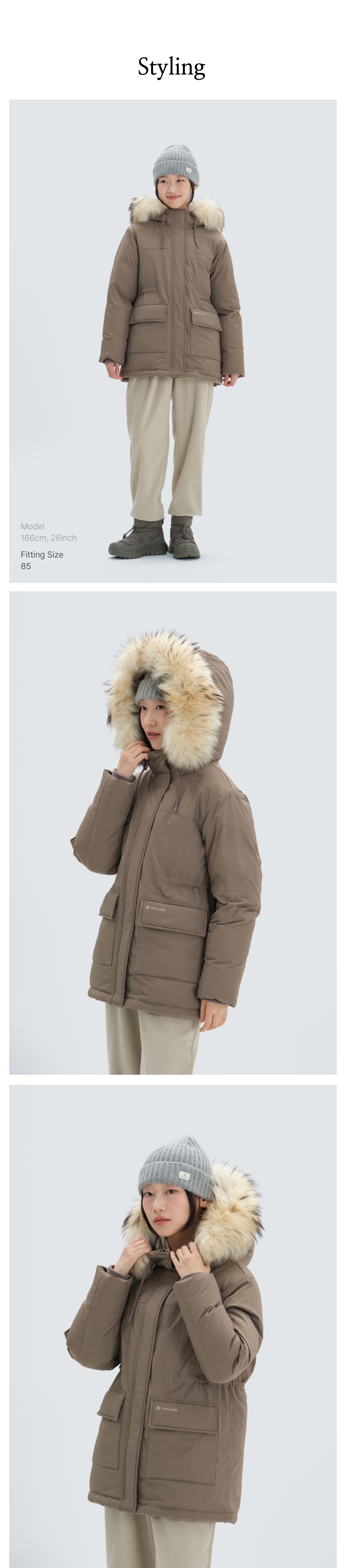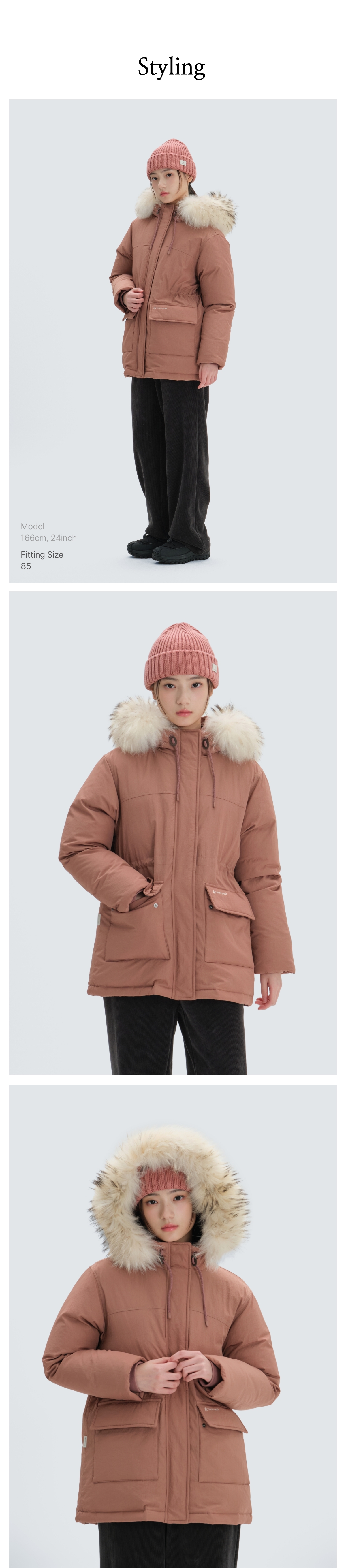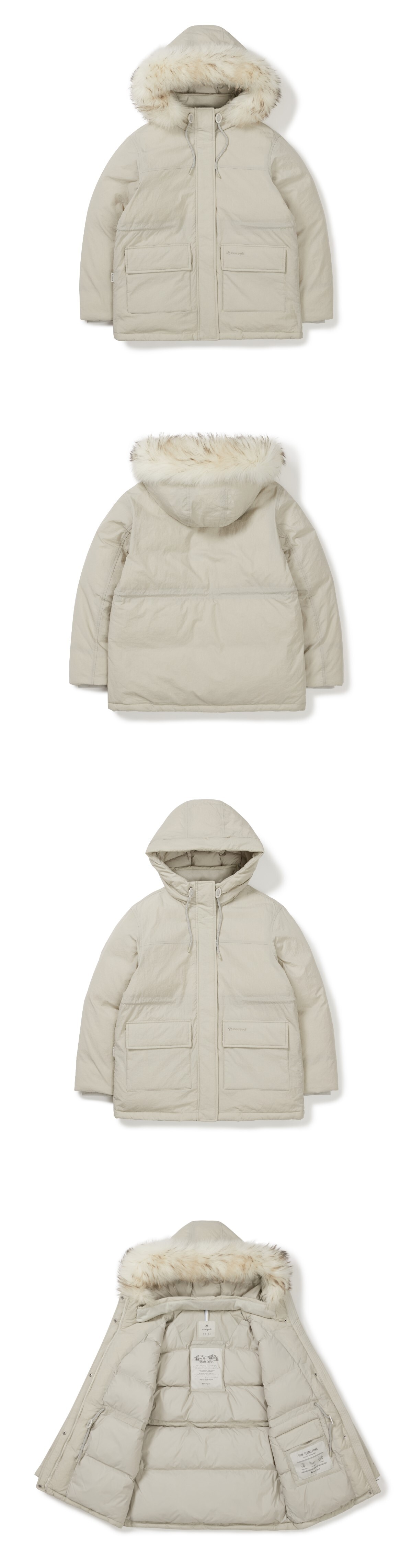 Material : [Exterior] Nylon 100% / [Exterior 2] Polyester 98% , Polyurethane 2% / [Lining] Nylon 100% / [Filling] Fluffy (Duck) 80% , Feather (Duck) 20% / [Charging Bag] Polyester 100% / [Hat Fur] Natural (Raccoon) 100% / [Pocket] 100%