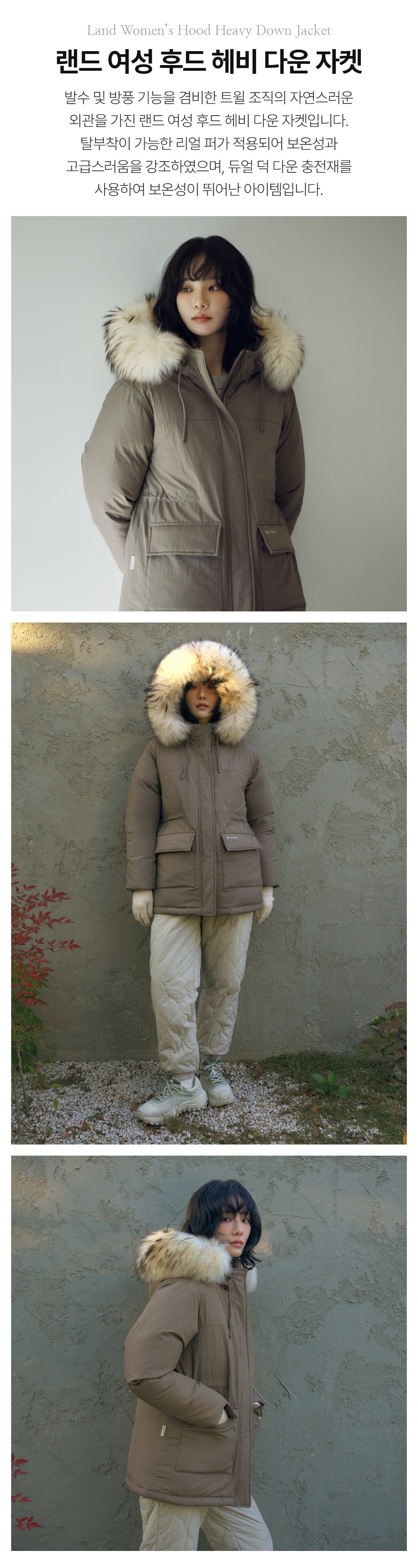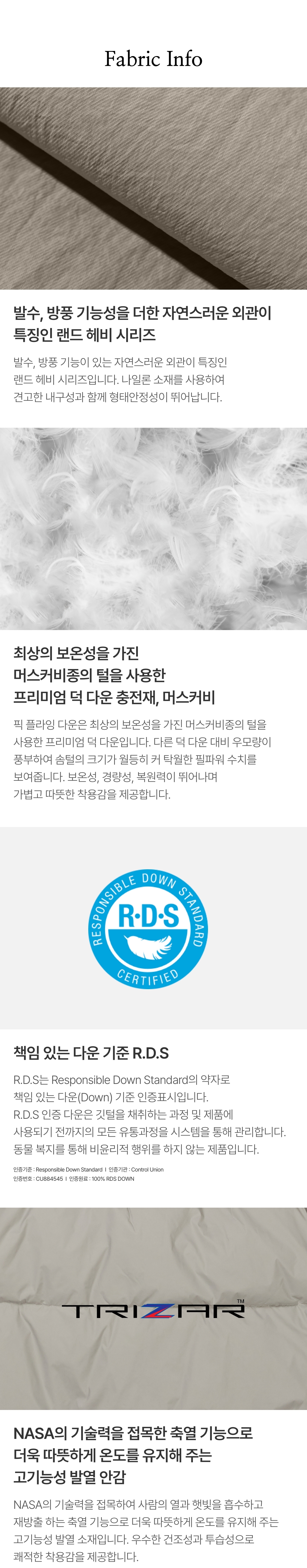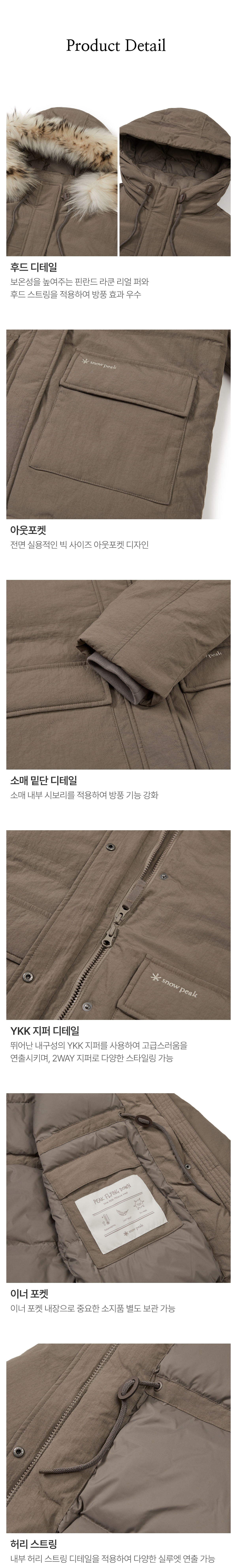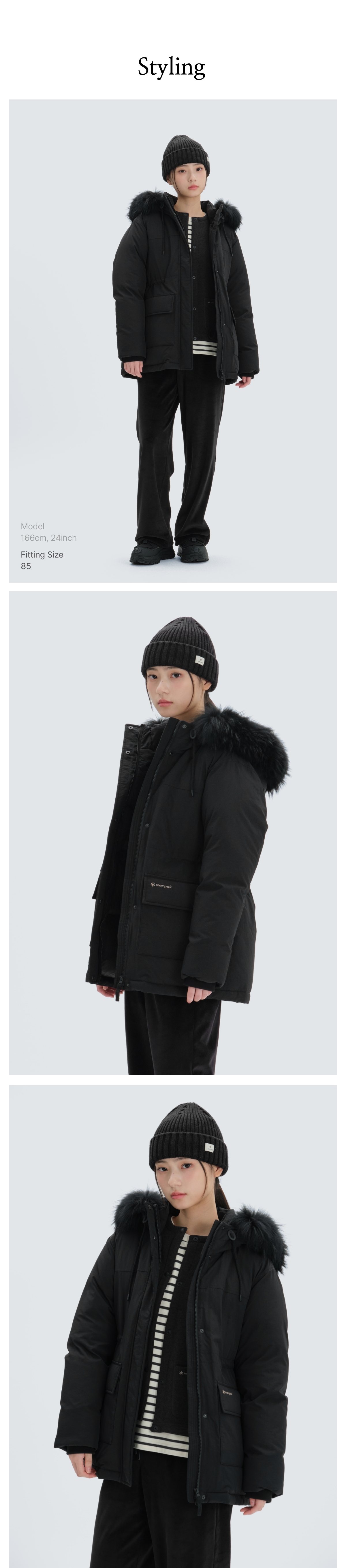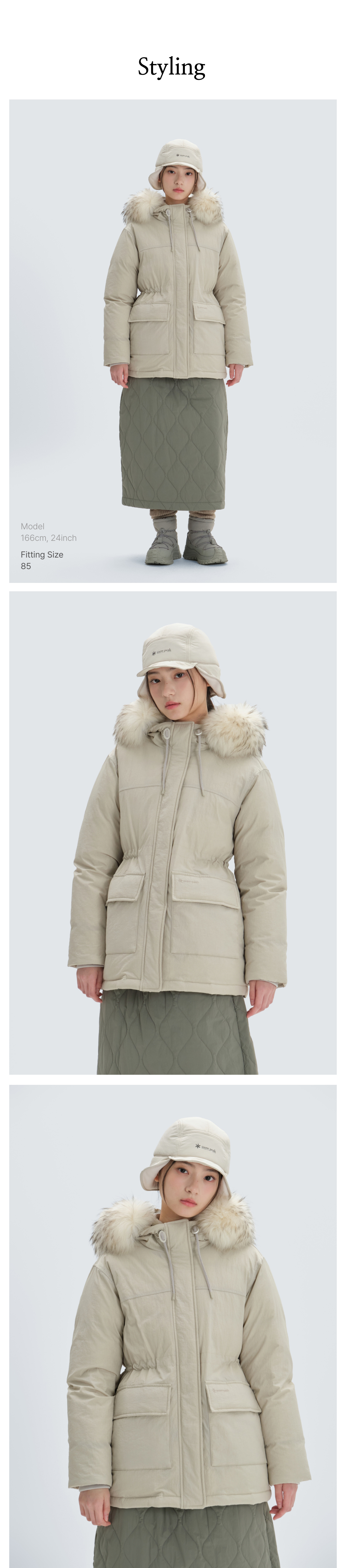 Material : [Exterior] Nylon 100% / [Exterior 2] Polyester 98% , Polyurethane 2% / [Lining] Nylon 100% / [Filling] Fluffy (Duck) 80% , Feather (Duck) 20% / [Charging Bag] Polyester 100% / [Hat Fur] Natural (Raccoon) 100% / [Pocket] 100%