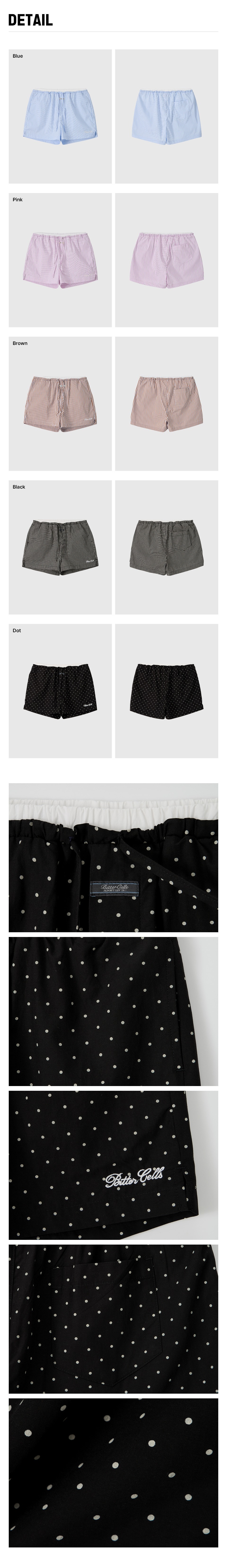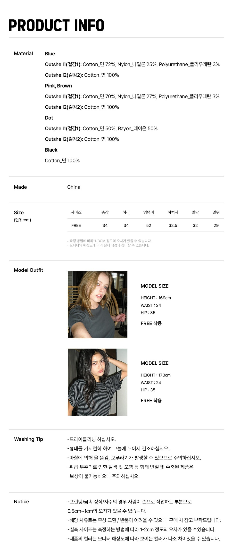Blue - [Outshell 1] Cotton 72% , Nylon 25% , Polyurethane 3% / [Outshell 2] Cotton 100% ; Pink & Brown - [Outshell 1] Cotton 70% , Nylon 27% , Polyurethane 3% / [Outshell 2] Cotton 100% ; Dot - [Outshell 1] Cotton 50% , Rayon 50% / [Outshell 2] Cotton 100% ; Black - Cotton 100%