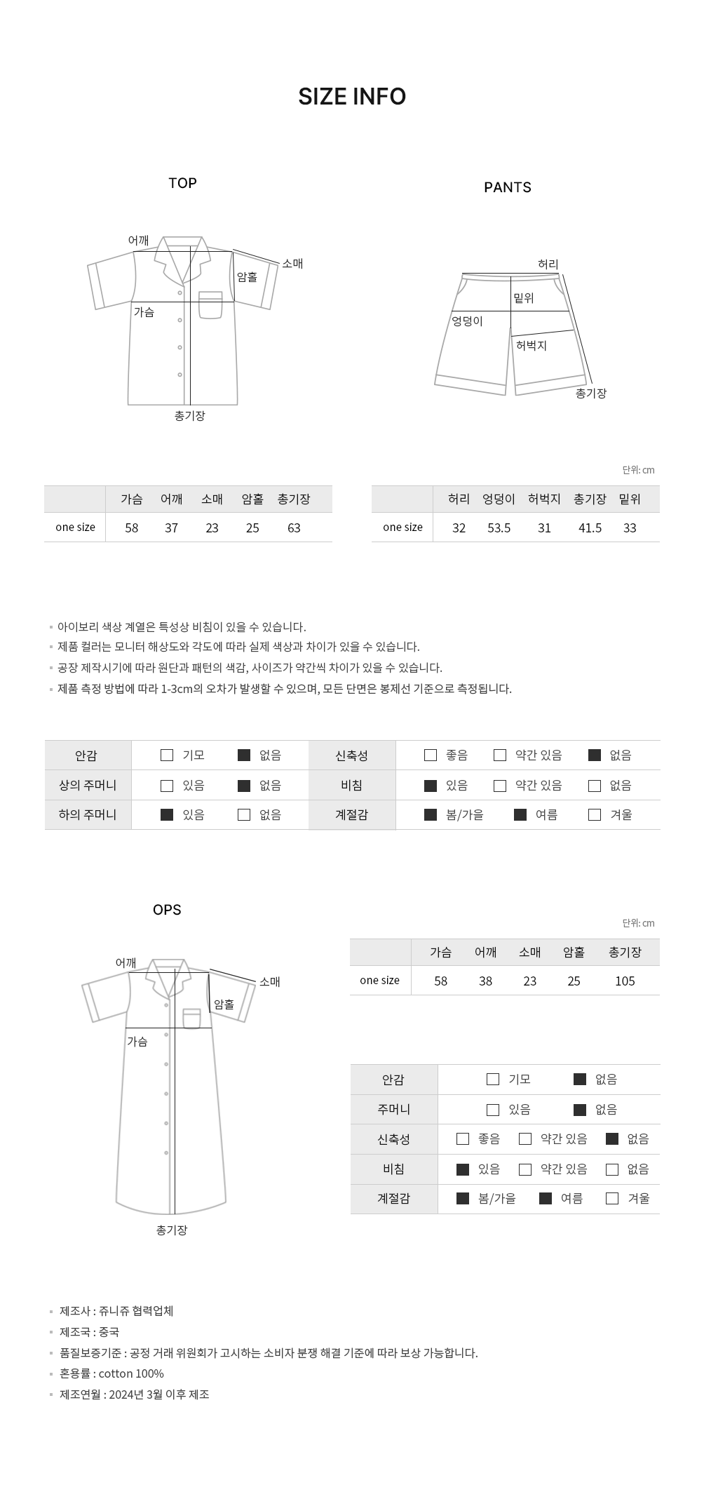 2ps(上衣): 總長 63 / 肩寬 37 / 胸寬 58 / 袖長 23 (cm)