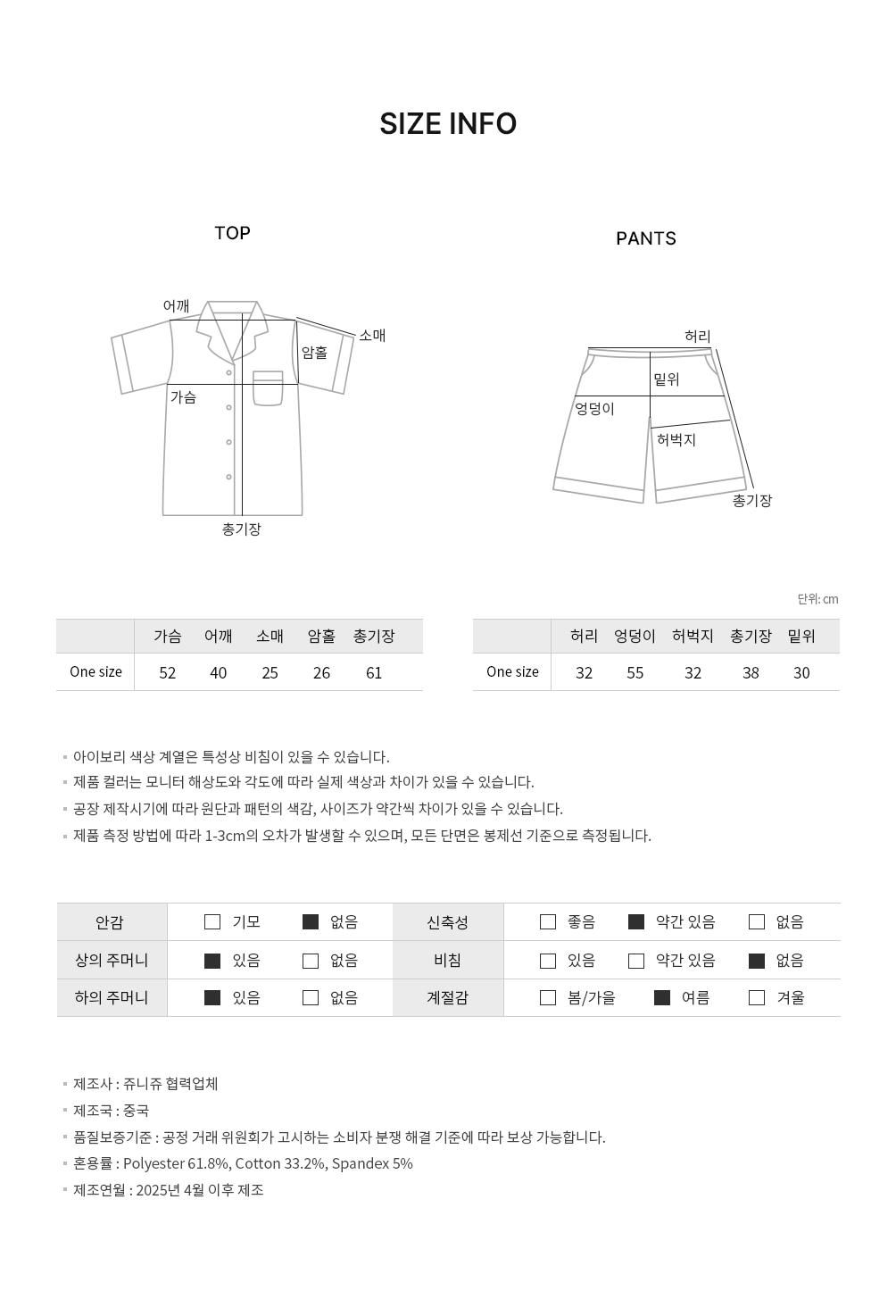 上衣: 總長 61 / 肩寬 40 / 胸寬 52 / 袖長 26 (cm)