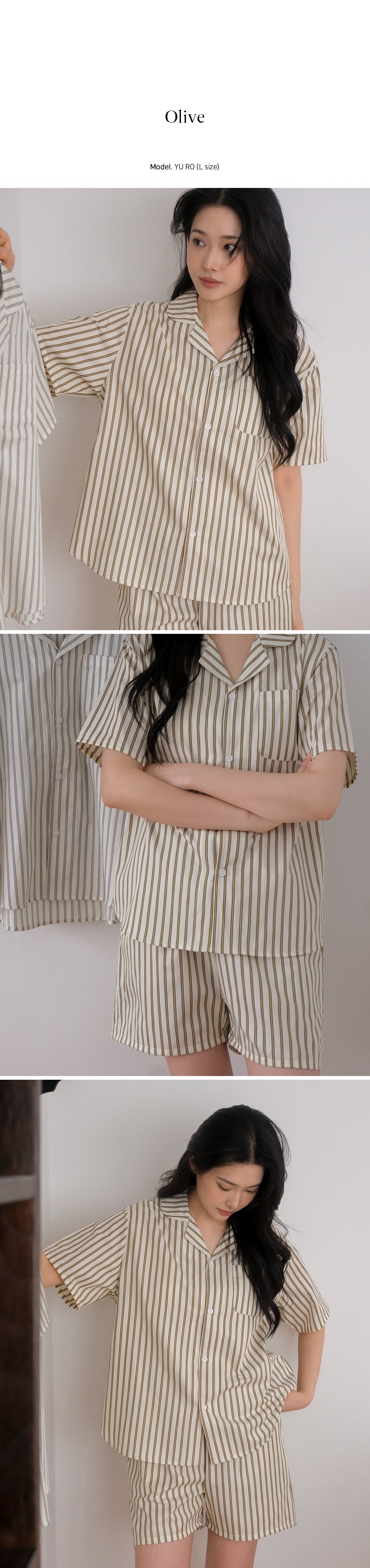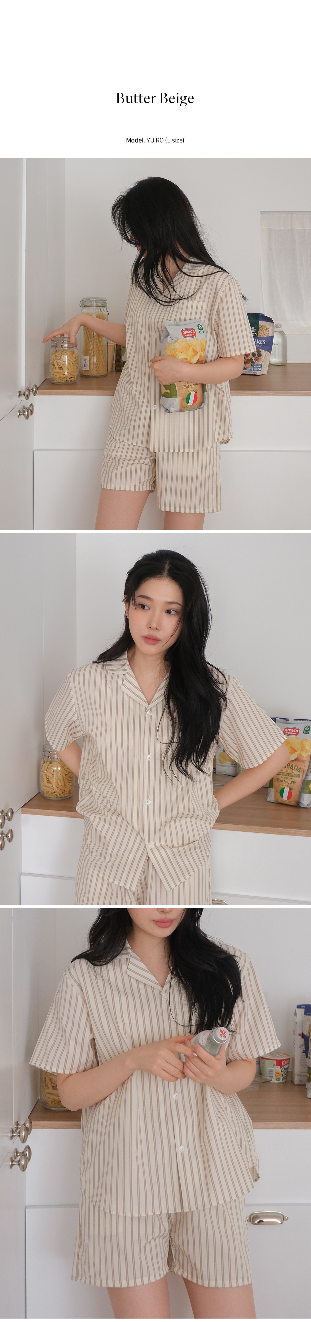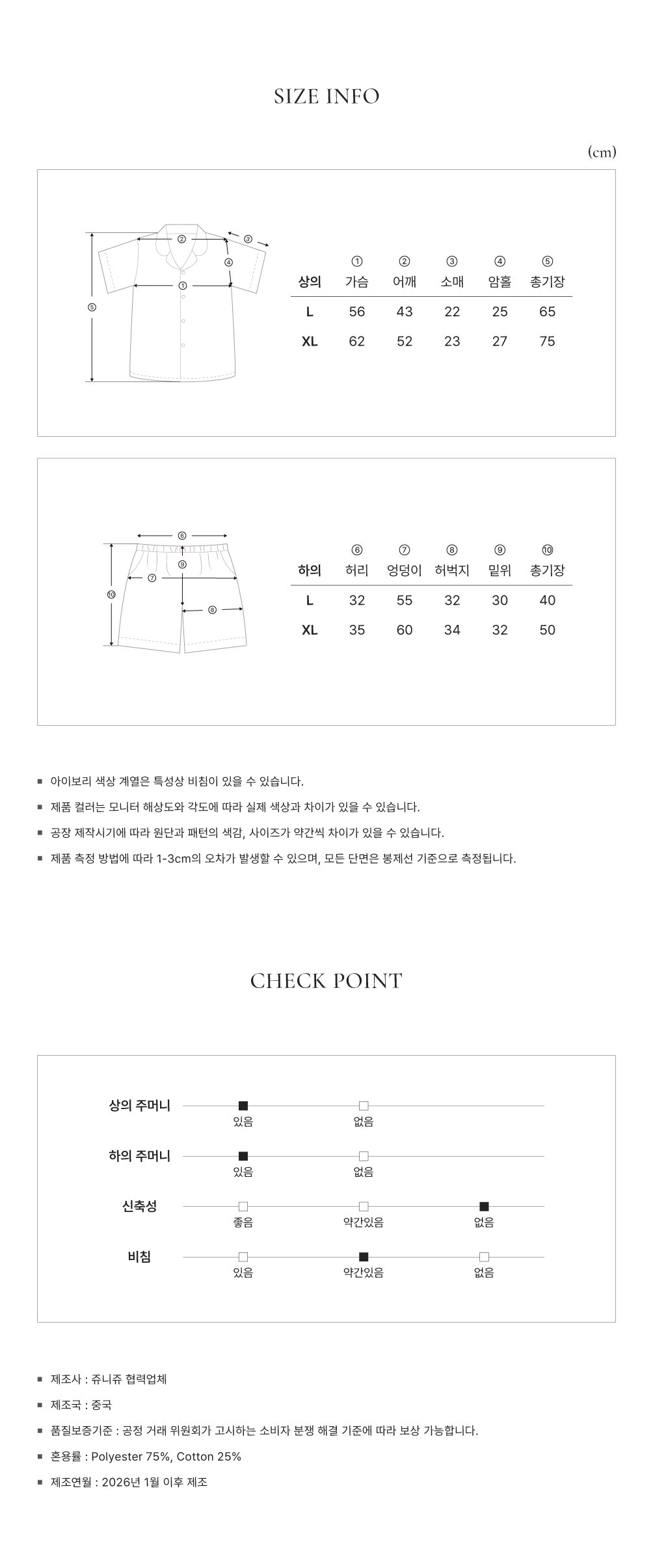 L (上衣): 總長 65 / 肩寬 43 / 胸寬 56 / 袖長 22 (cm)