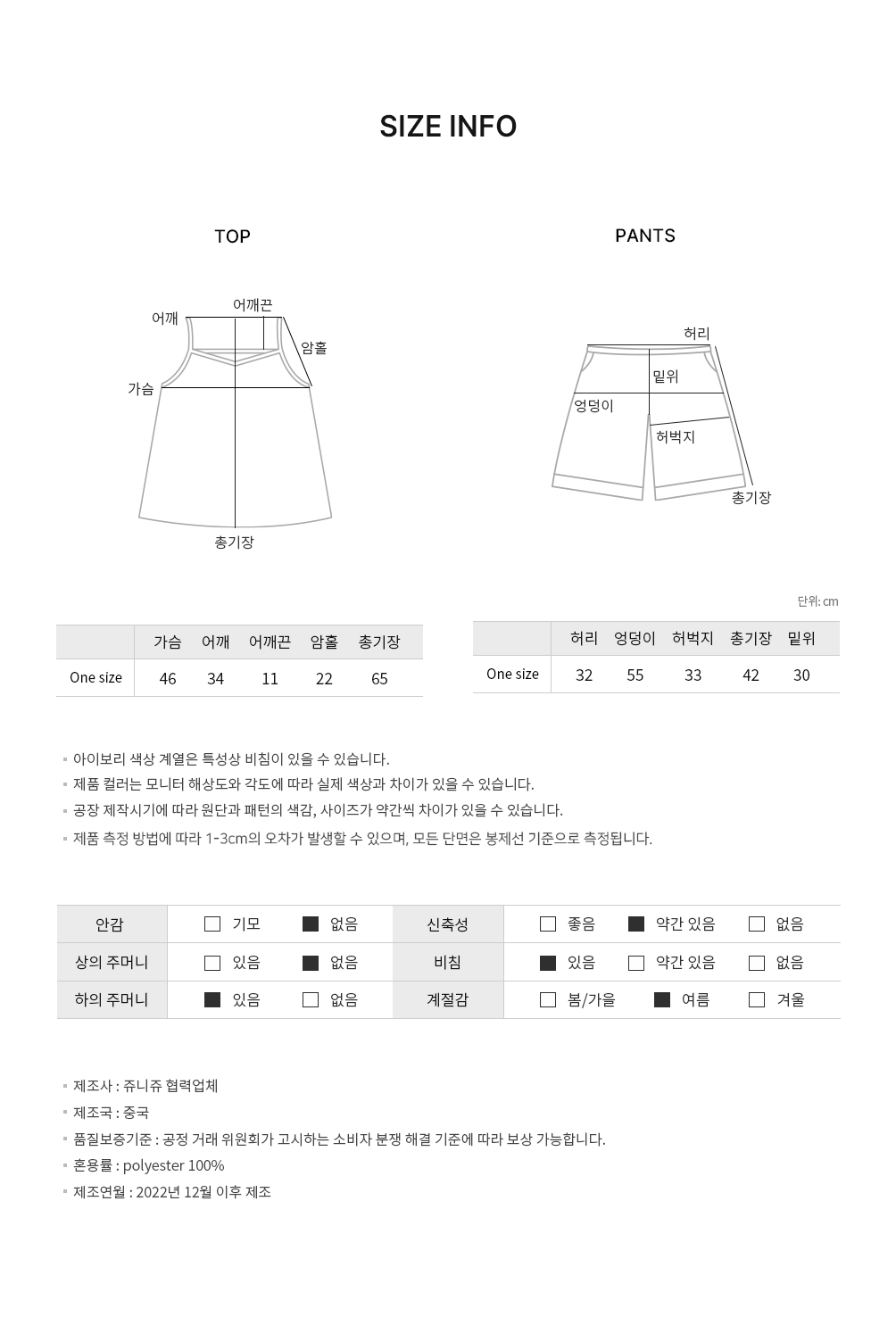 上衣: 胸寬 46 / 肩寬 34 / 肩帶 11 / 手臂口 22 / 總長 65 (cm)