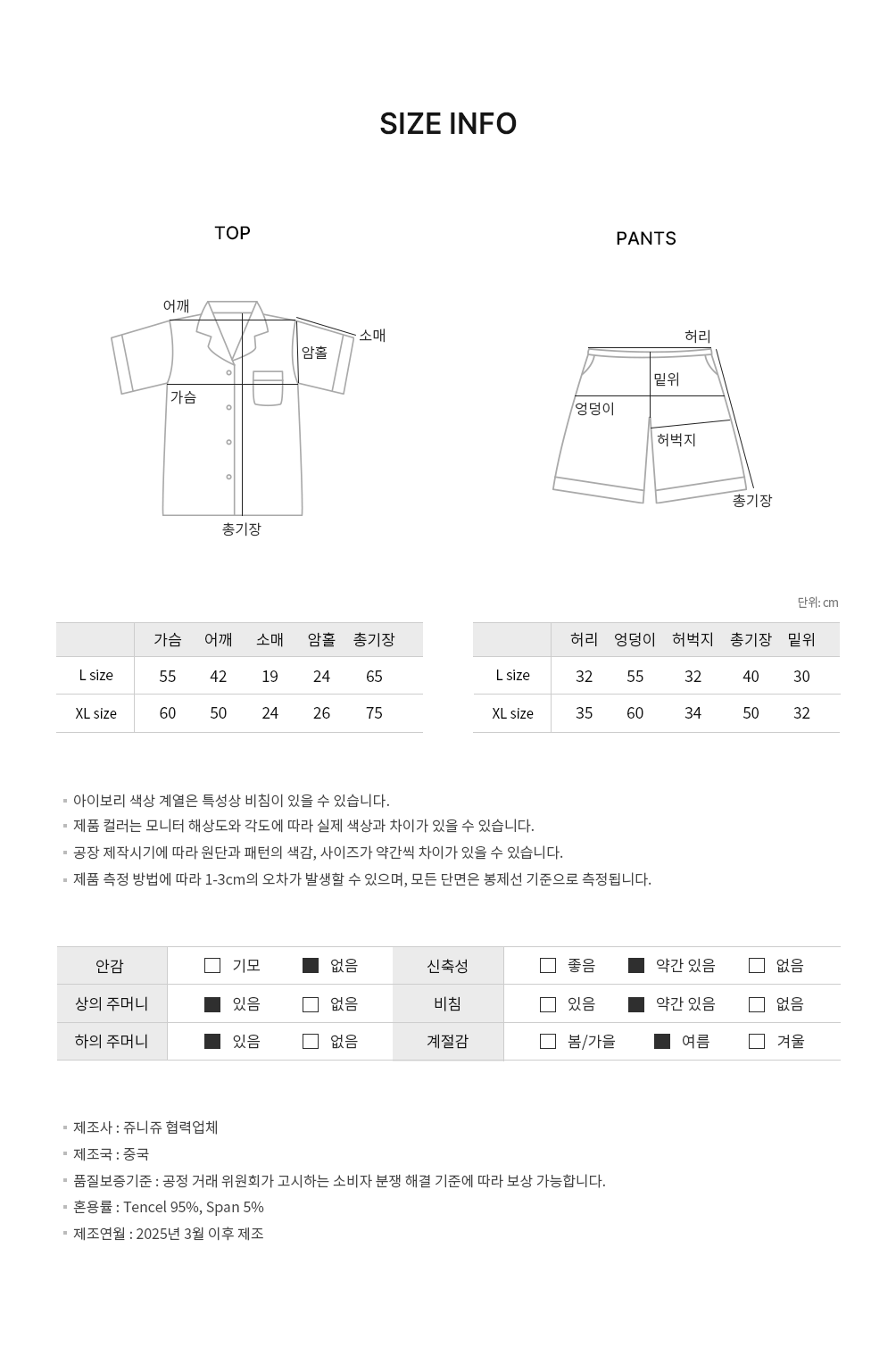 L (上衣): 總長 65 / 肩寬 42 / 胸寬 55 / 袖長 19 (cm)