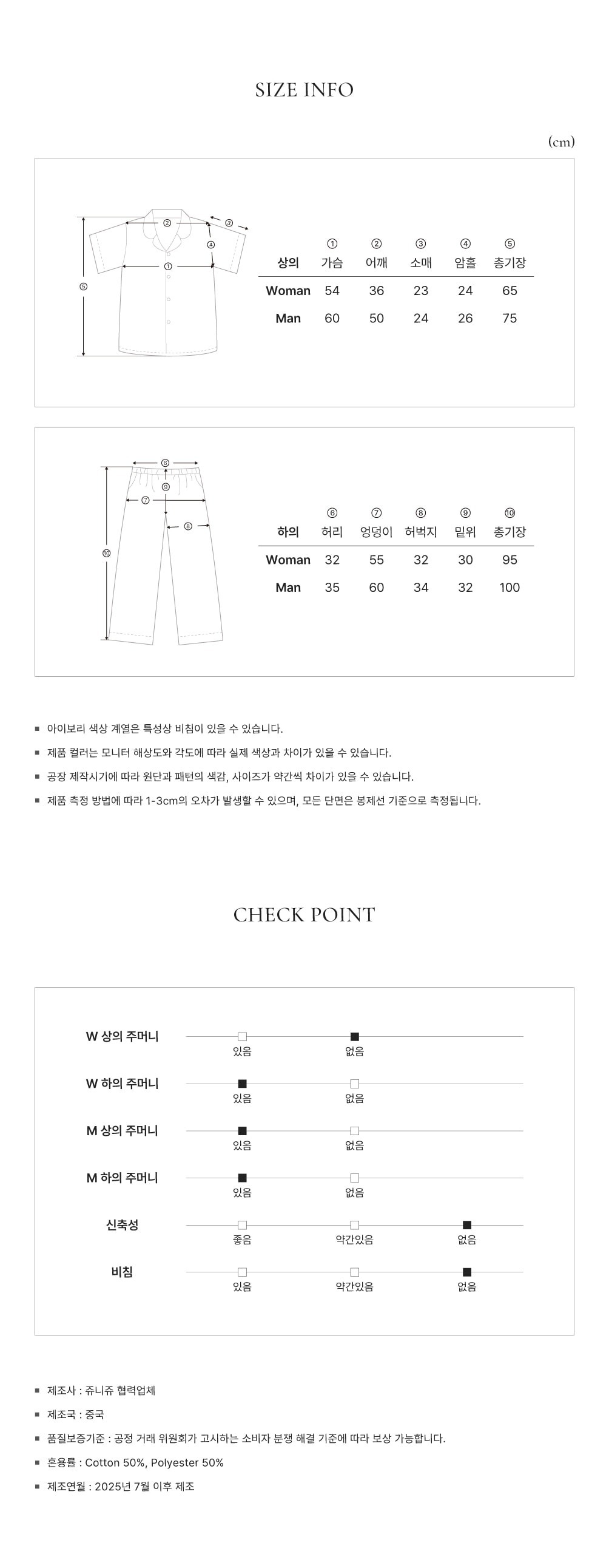 Woman (褲): 總長 95 / 腰寬 32 / 臀寬 55 / 大腿寬 32 (cm)