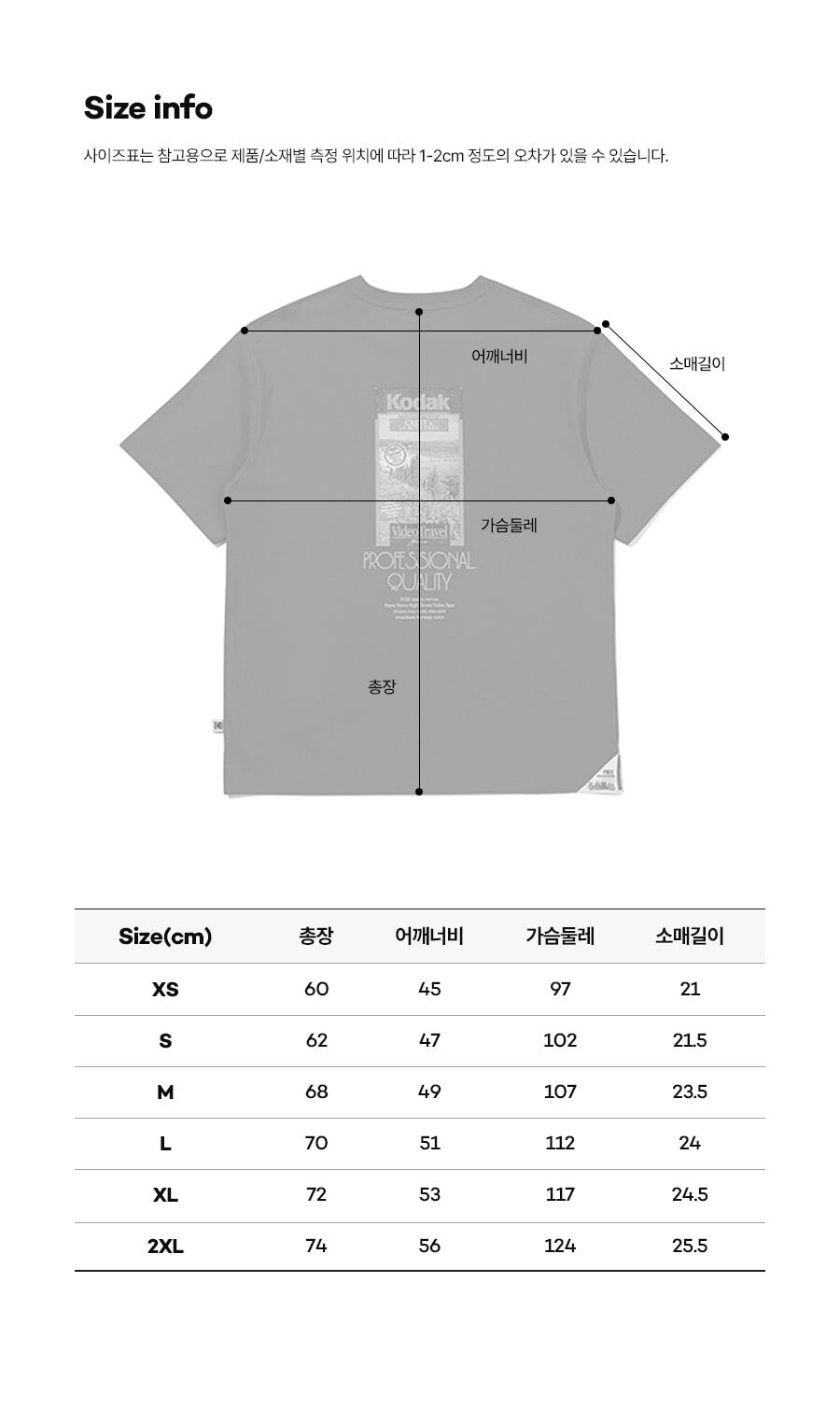 2XL(110): 總長 74 / 肩寬 56 / 胸圍 124 / 袖長 25.5 (cm)