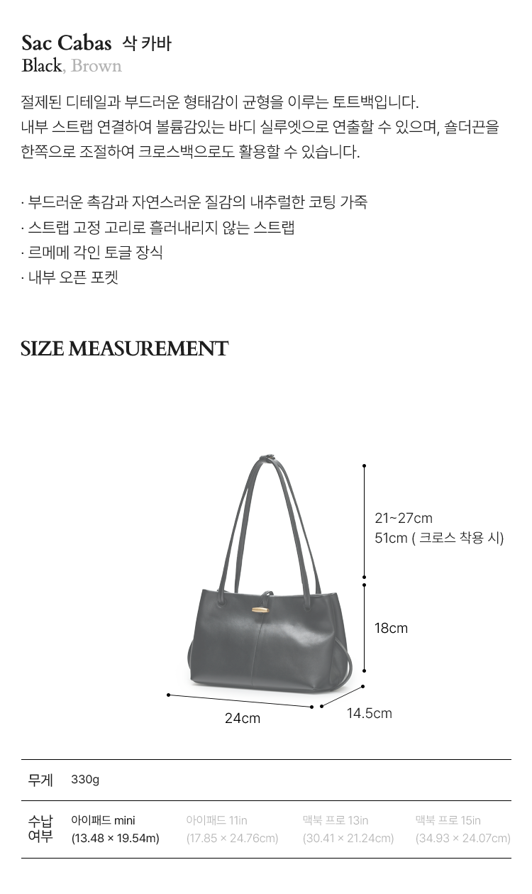 Size : 24 (W) X 18 (H) X 14.5 (D) cm ; HANDLE DROP 21cm / SHOULDER DROP 51cm