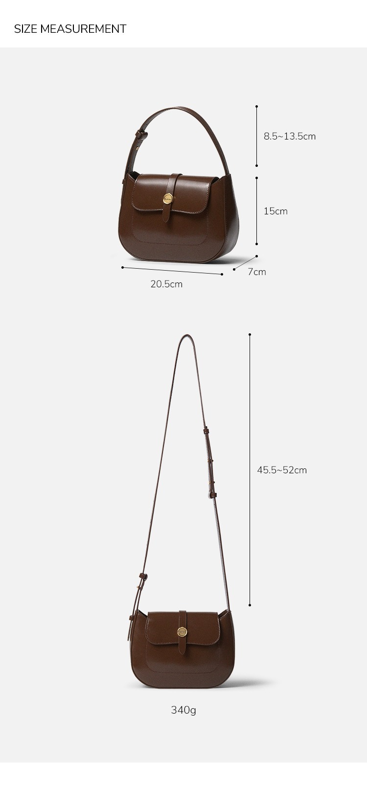 Size : 20.5 x 7 x 15 (cm)  / Handle Drop: 8.5-13.5 (cm) /  Shoulder Strap: 45.5-52 (cm)