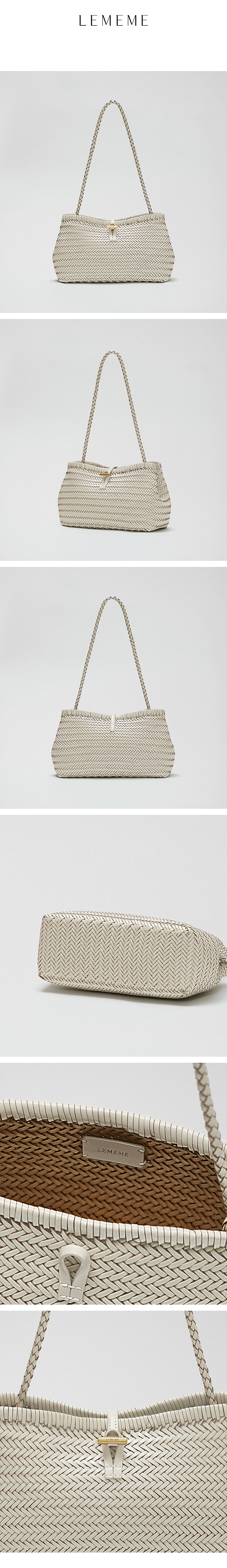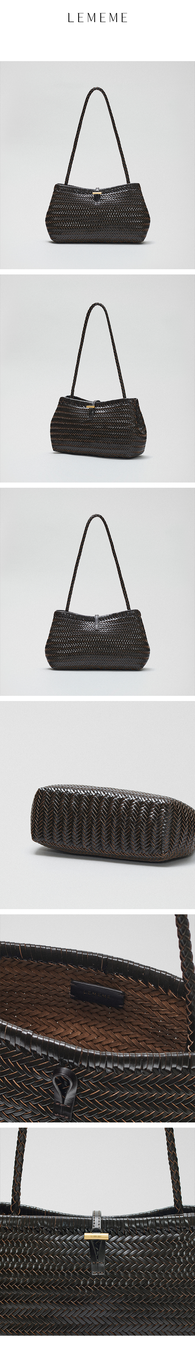 這款編織肩包採用手工編織的皮革肩帶,完美展現了 Lememe 標誌性的復古輪廓。