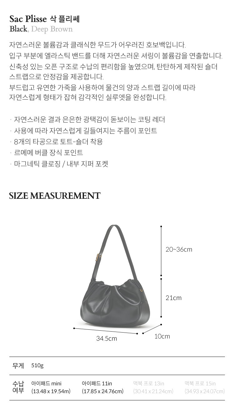 Size : 34.5 (W) X 21 (H) X 10 (D) cm ; HANDLE DROP 20-36cm 510g