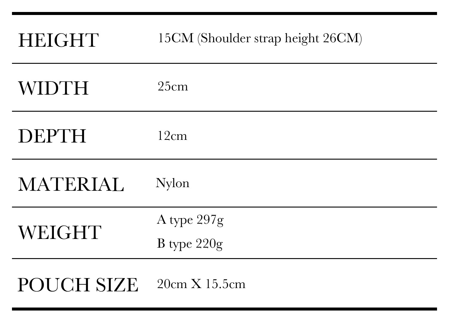 Size : 15 x 25 x 12 (cm) / Pouch : 20 x 15.5 (cm) / Shoulder Strap(H) : 26 (cm)